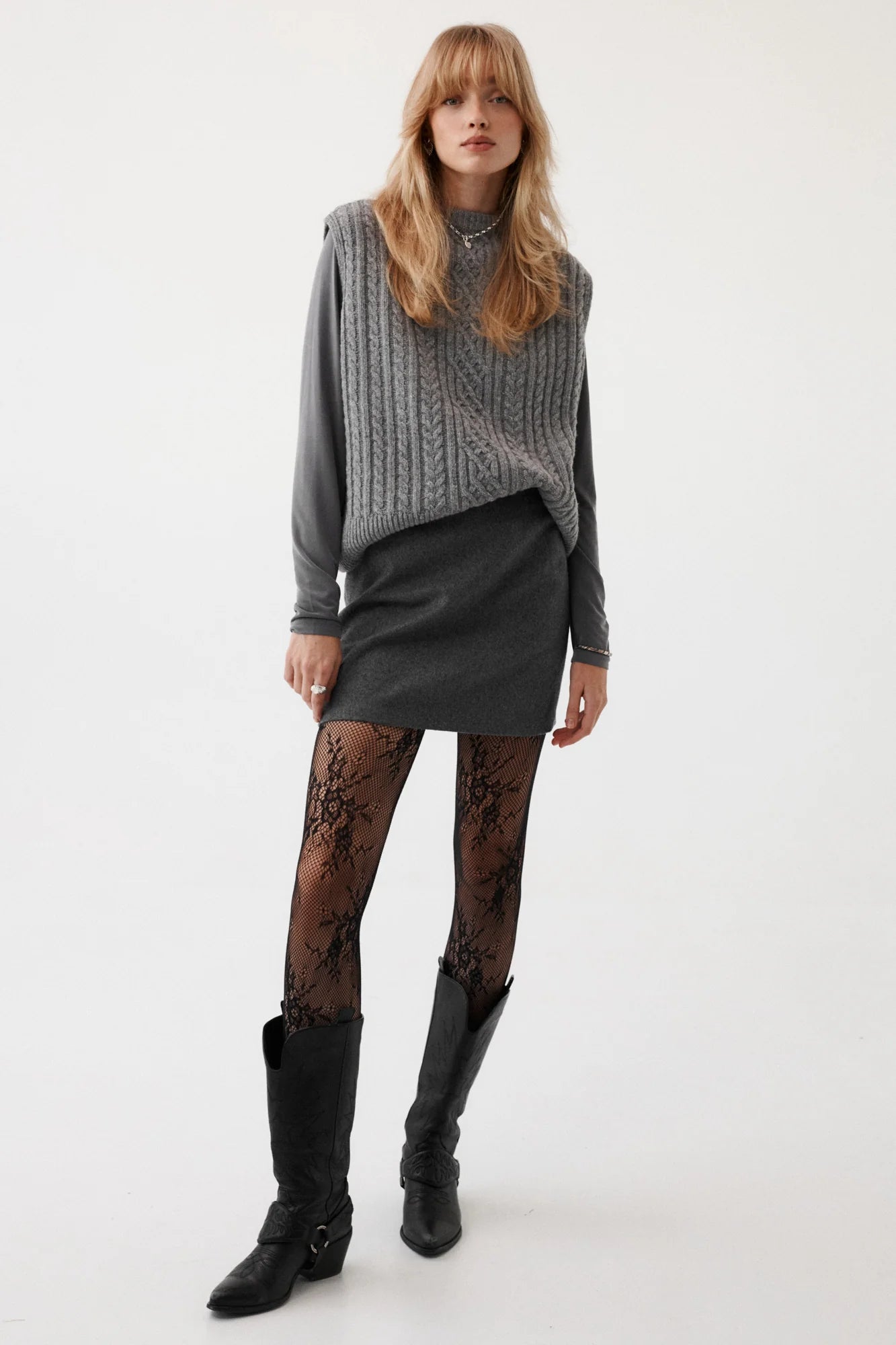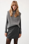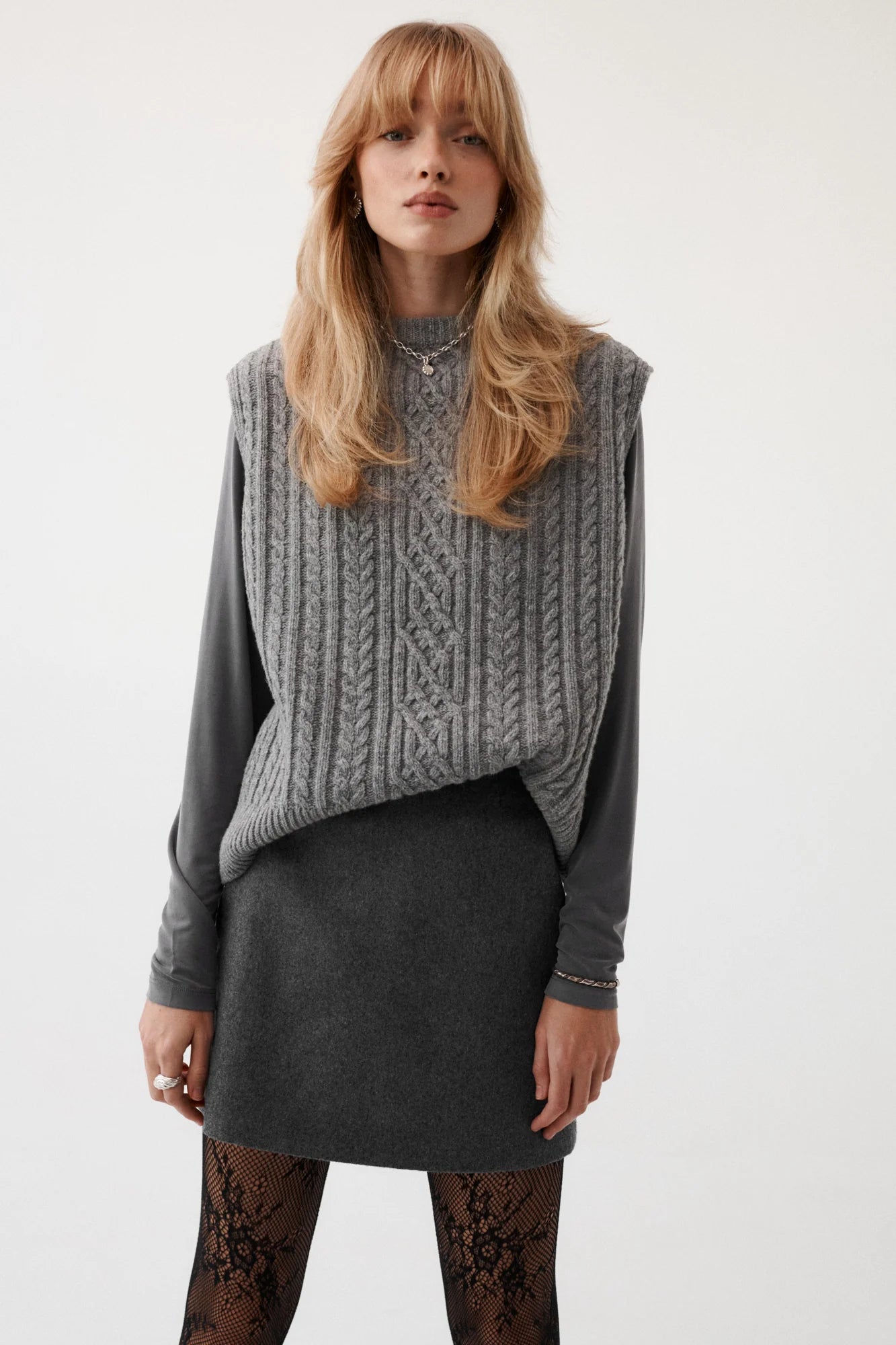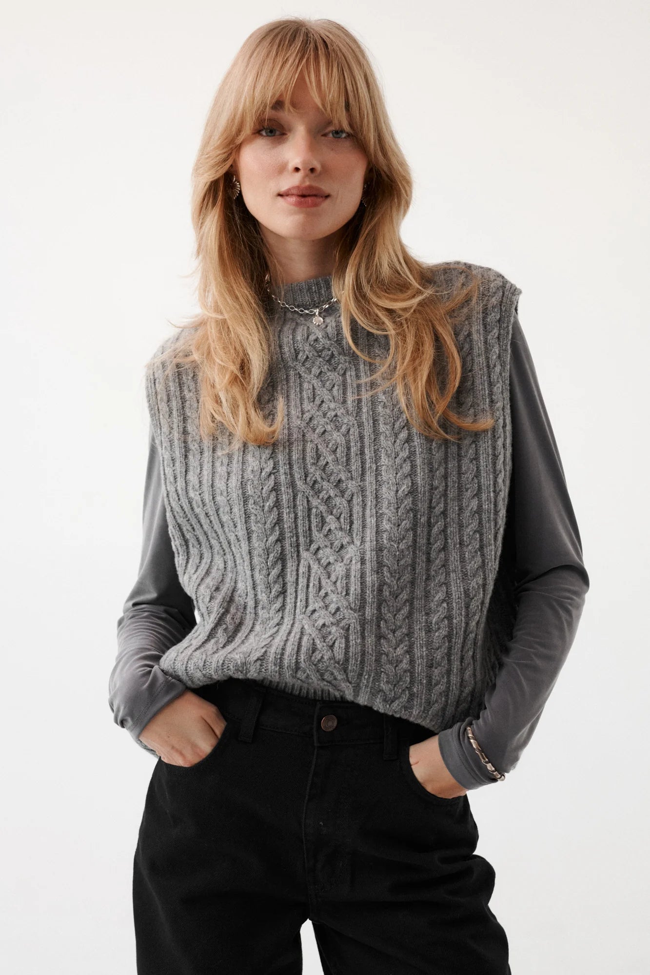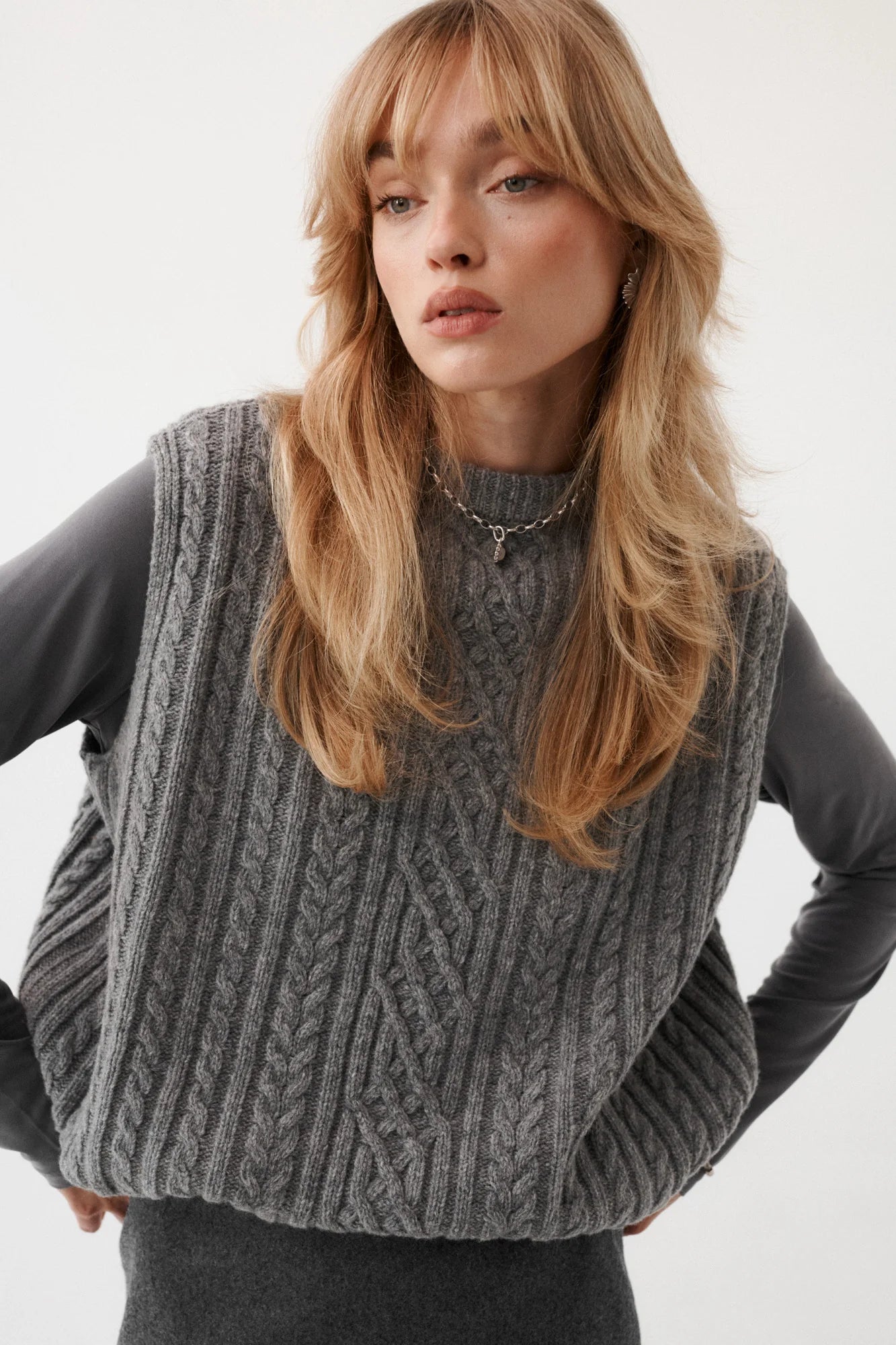 Luźna kamizelka z dekoracyjnym, warkoczowym splotem. Pudełkowy fason i wysokiej jakości, włoska wełna sprawia, że sweter świetnie sprawdzi w wielu stylizacjach.