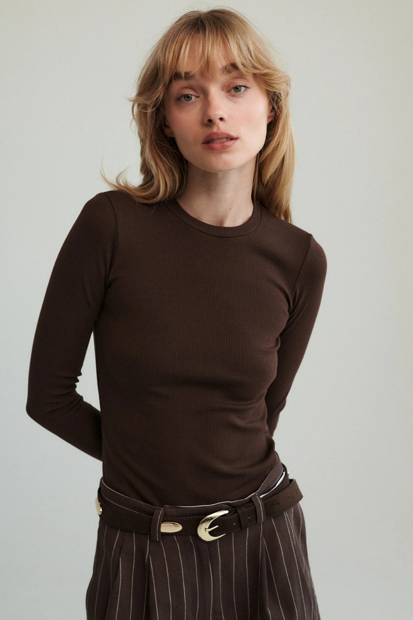 Klasyczny, dopasowany top z długim rękawem. Miekka, prążkowana bawełna organiczna sprawia że longsleeve jest wygodny i funkcjonalny. Doskonała i niezawodna baza Twojej garderoby.