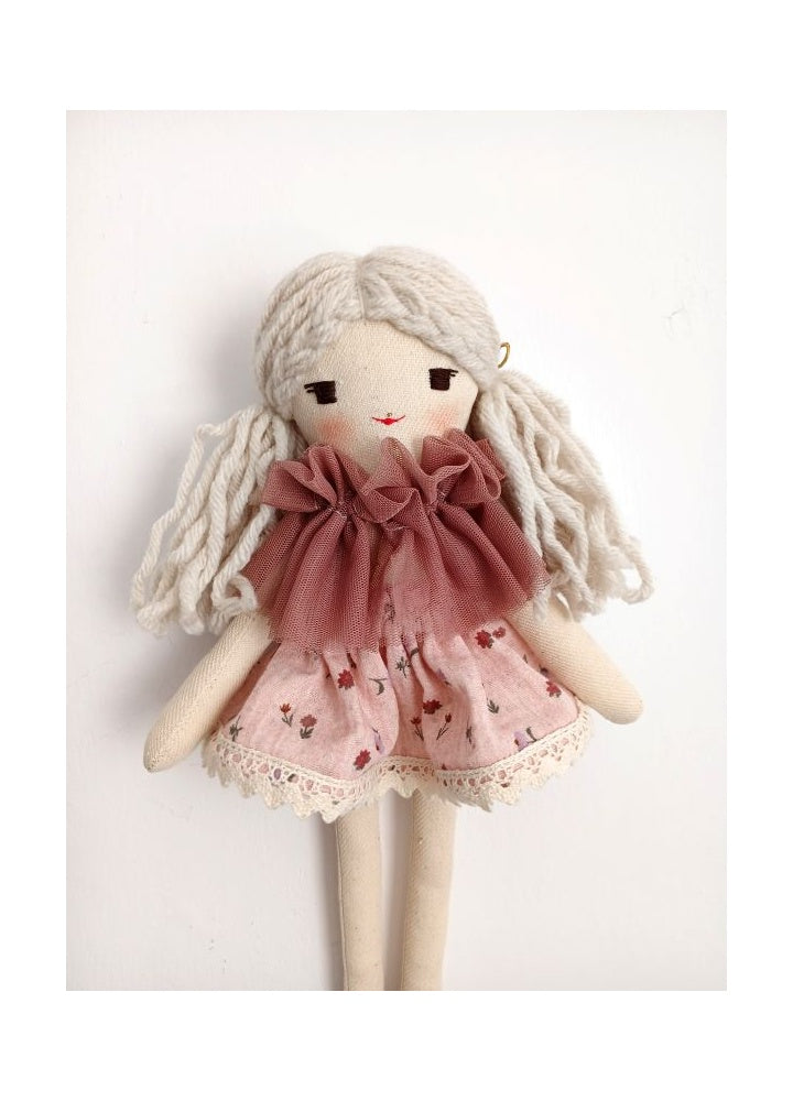 To jest lalka Elena w muślinowej spódniczce w kwiatuszki. Ubrana w tiulowy kołnierzyk w kolorze ciemnego różu.