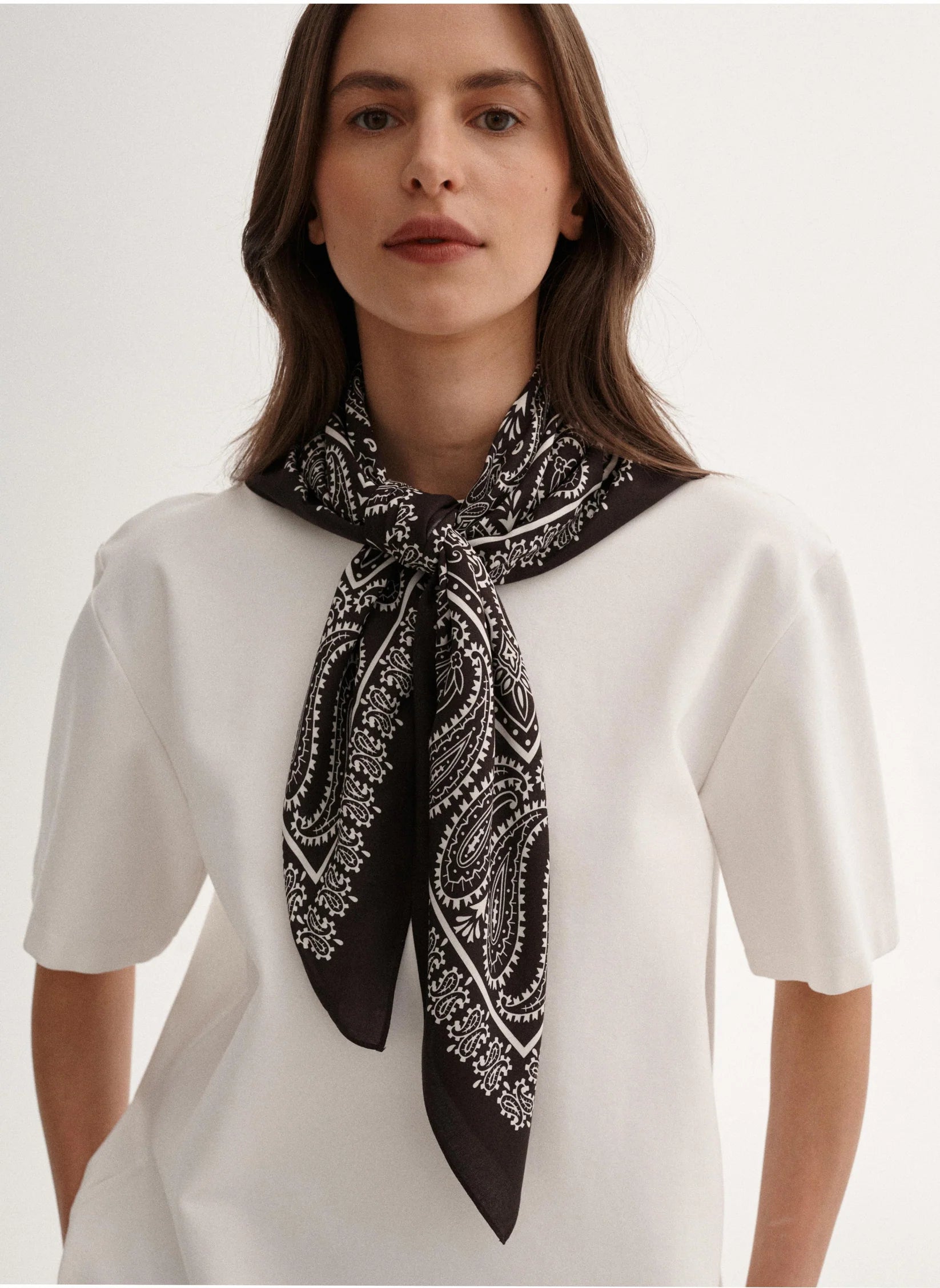 Uniwersalna bandana, ręcznie wykończona, wykonana z miękkiej wiskozy w kolorze głębokiego brązu z nadrukiem w kolorze ecru.