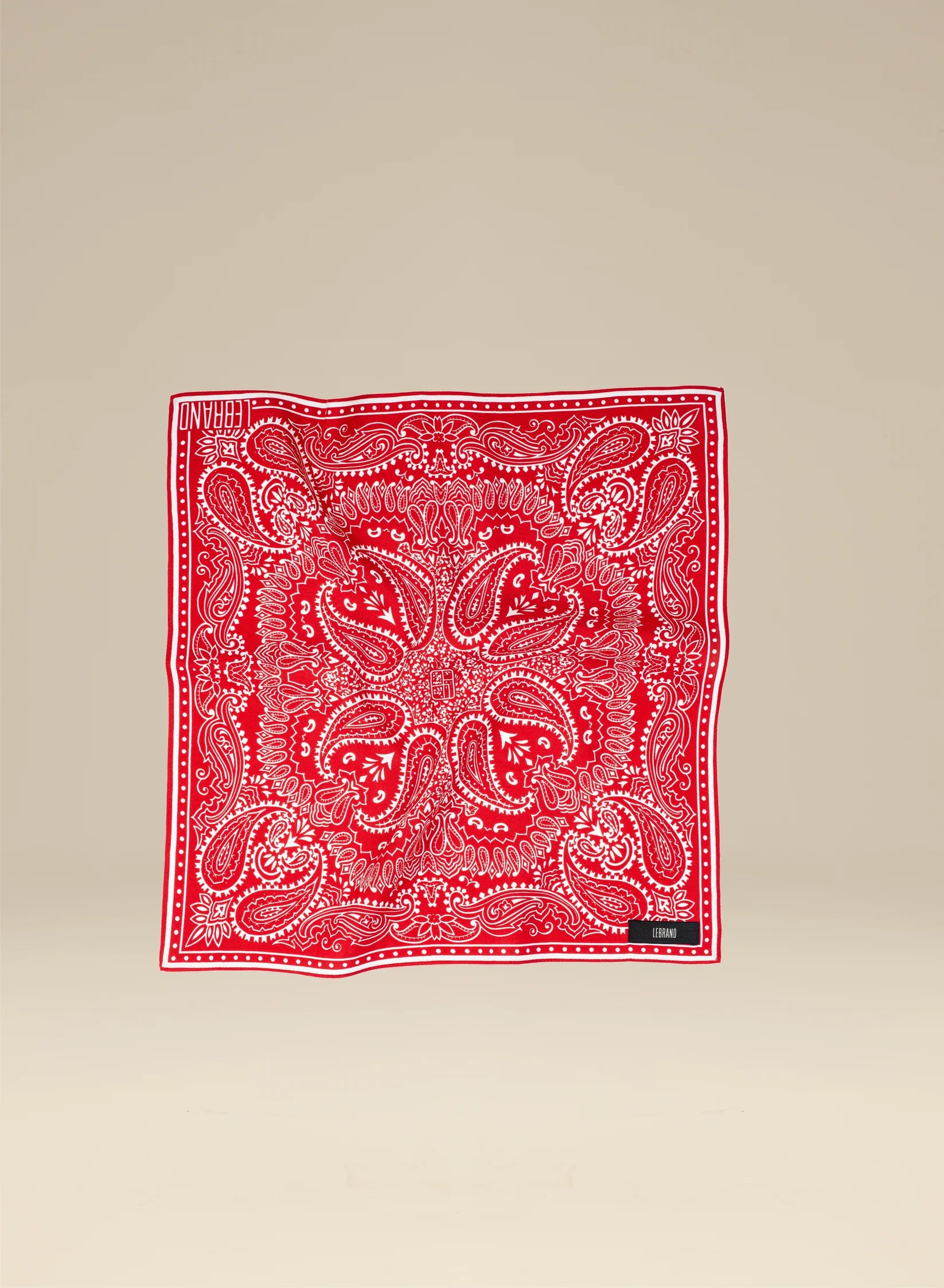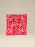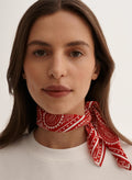 Uniwersalna bandana w rozmiarze mini, ręcznie wykończona, wykonana z miękkiej wiskozy w kolorze czerwonym z białym nadrukiem.