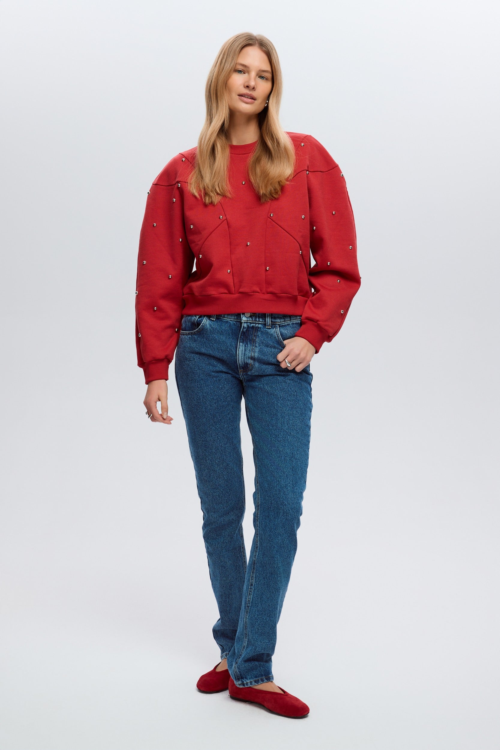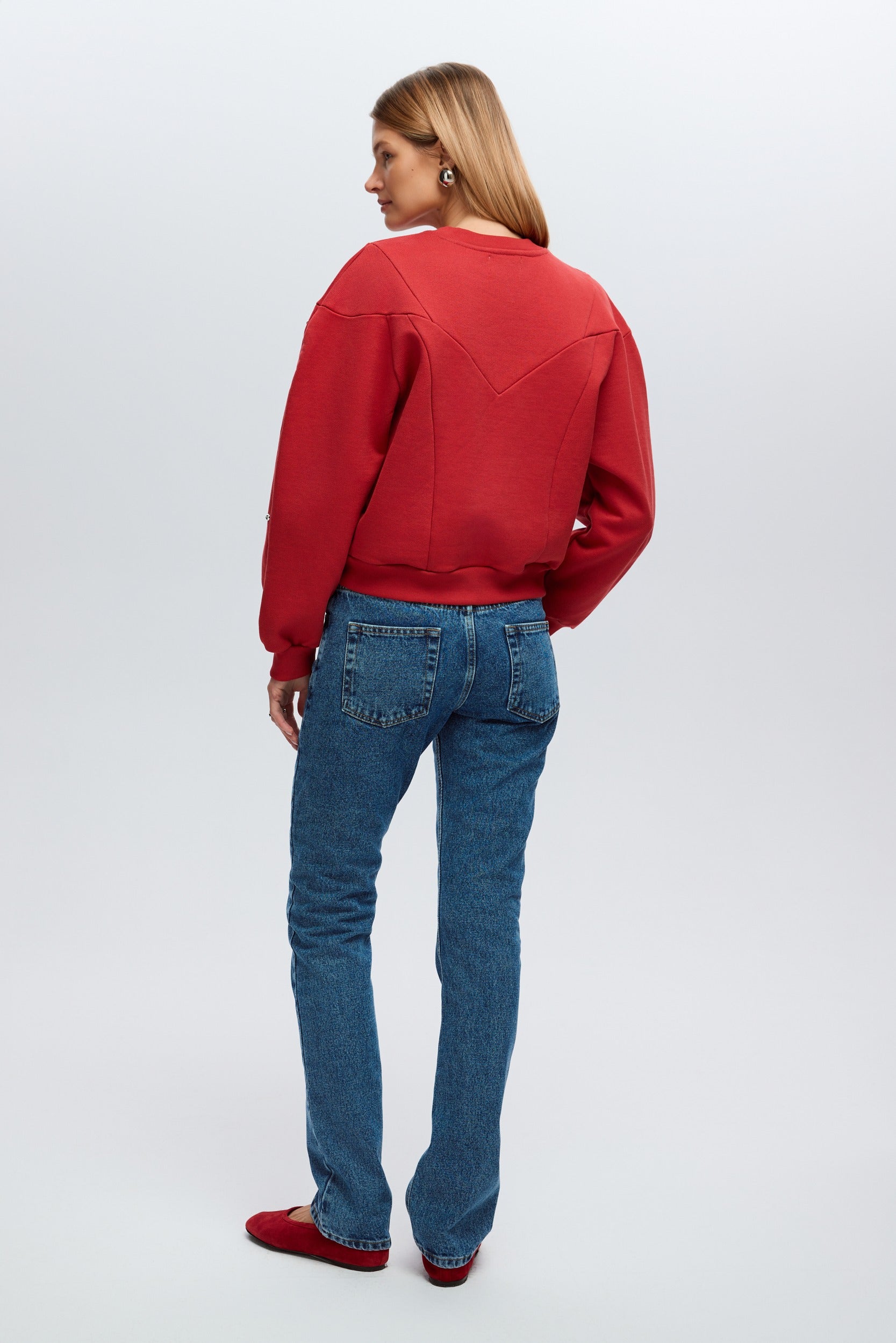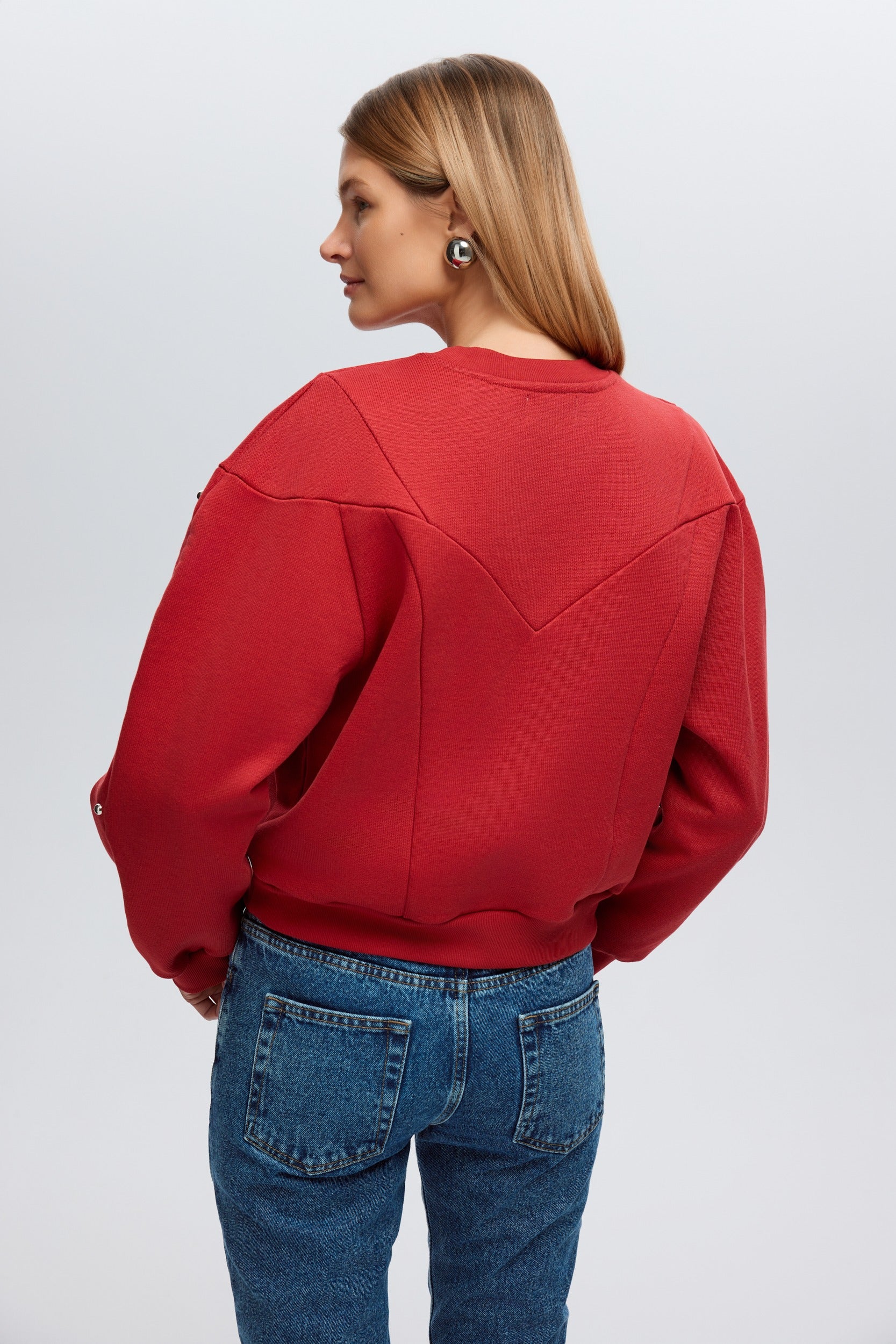 - Krótka czerwona bluza z poszerzonymi ramionami, bez poduch.