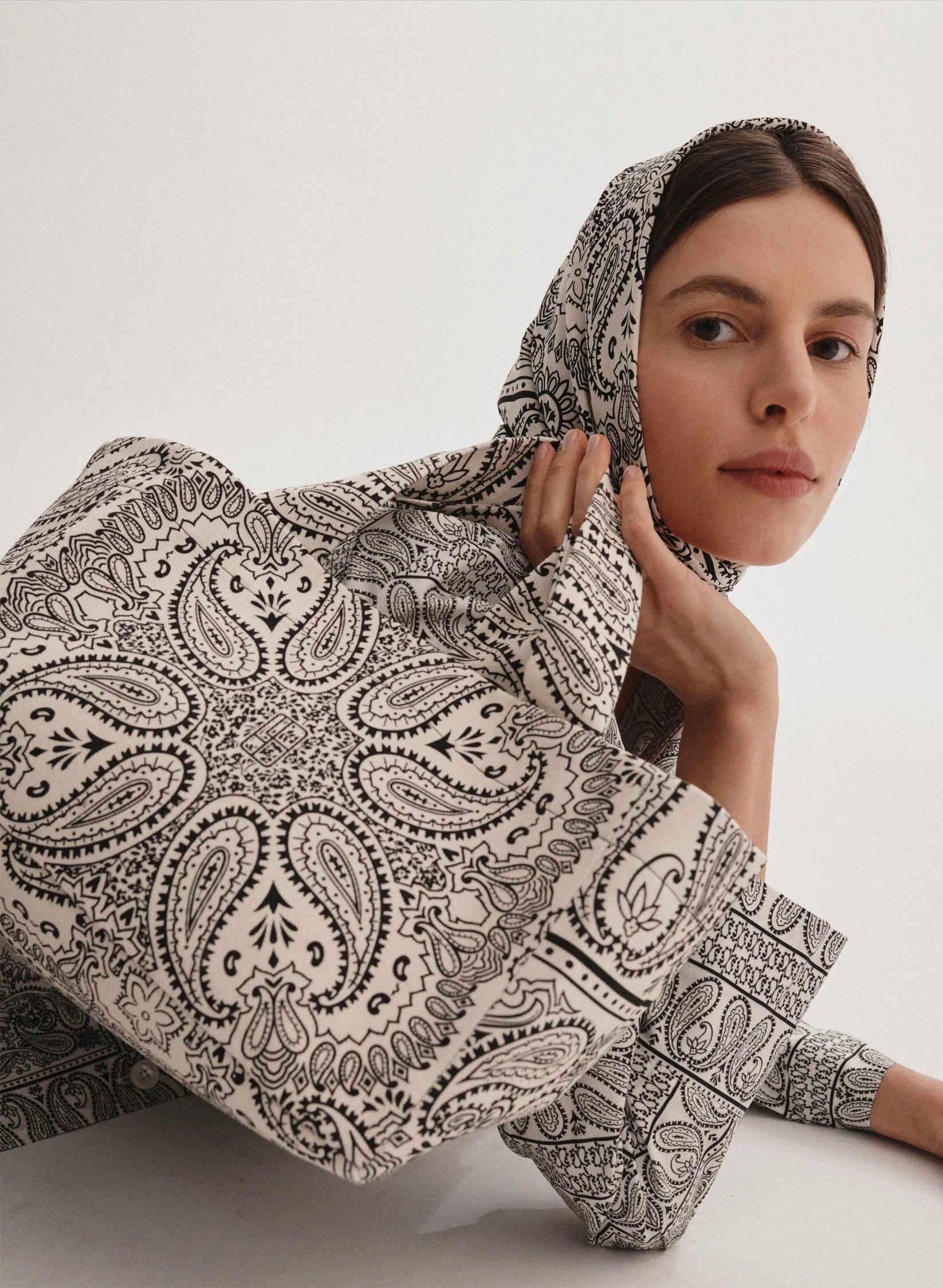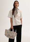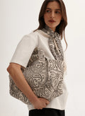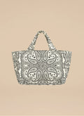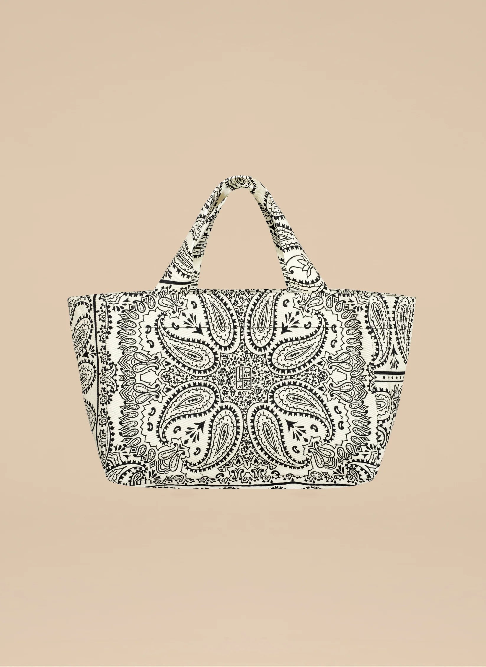 Mała torba typu mini shopper wykonana z grubego bawełnianego płótna z nadrukiem bandany w kolorze ecru i czarnym. Bez zapięcia, posiada jedną wewnętrzną kieszonkę.