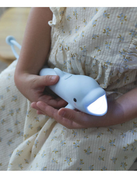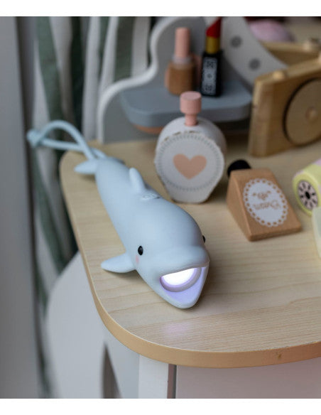 Latarka w kształcie delfina, pokryta miękkim silikonem, to połączenie zabawy i funkcjonalności. Dzięki poręcznej regulacji jasności sprawdzi się doskonale podczas wieczornych przygód, teatrów cieni i opowiadania bajek na dobranoc. Ładowana przez kabel USB-C, zapewnia wygodę i długie godziny użytkowania. Zawieszka umożliwia powieszenie latarki tam, gdzie jest najbardziej potrzebna.