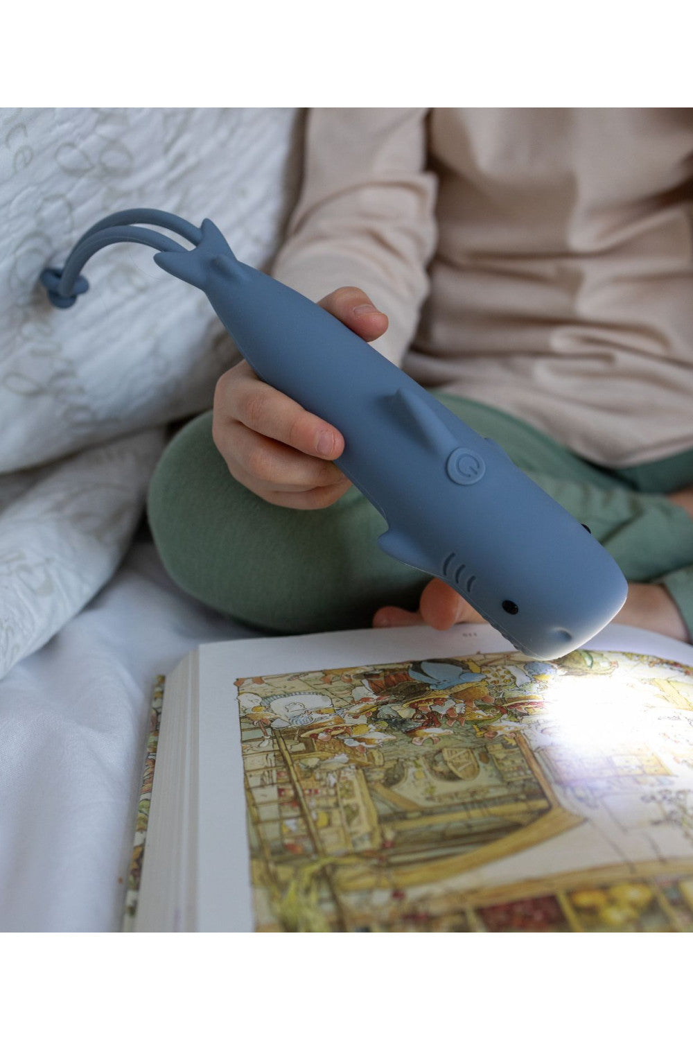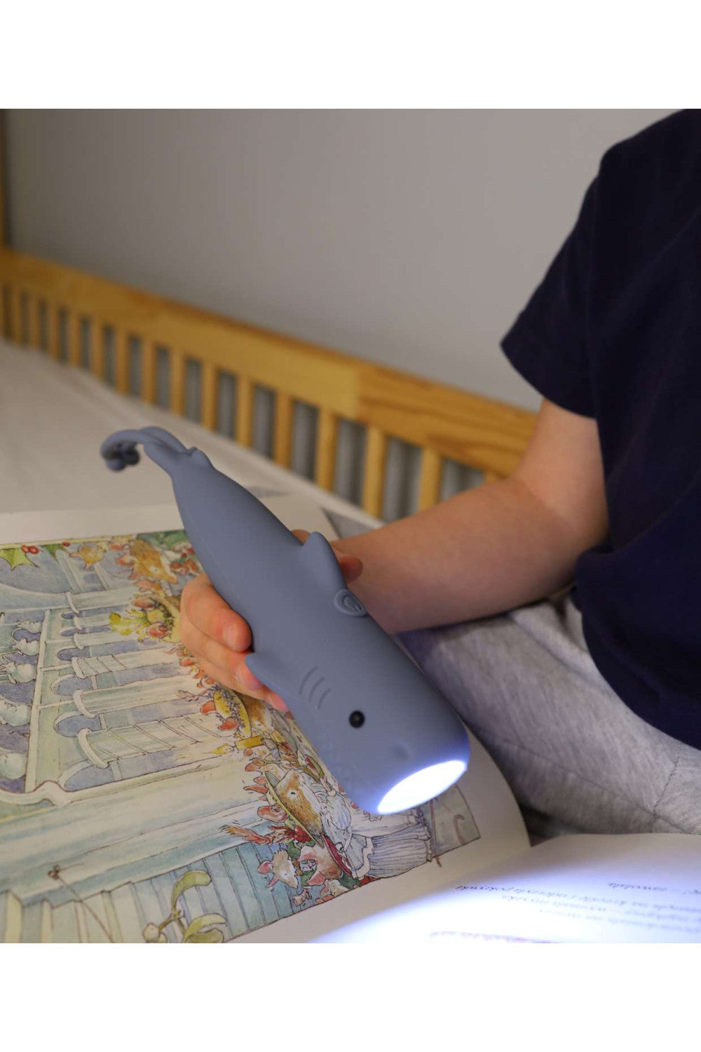 Latarka w kształcie rekina, pokryta miękkim silikonem, łączy funkcjonalność z zabawą. Dzięki poręcznej regulacji jasności jest idealna na wieczorne przygody, teatr cieni czy opowiadanie bajek na dobranoc. Ładowana przez kabel USB-C, zapewnia komfort i długie godziny użytkowania. Zawieszka umożliwia wygodne zawieszenie latarki tam, gdzie jest najbardziej potrzebna.