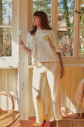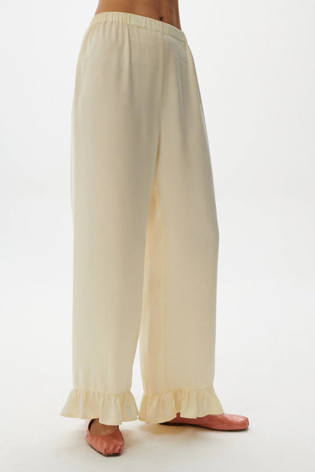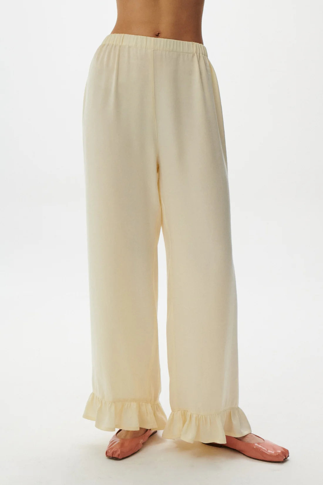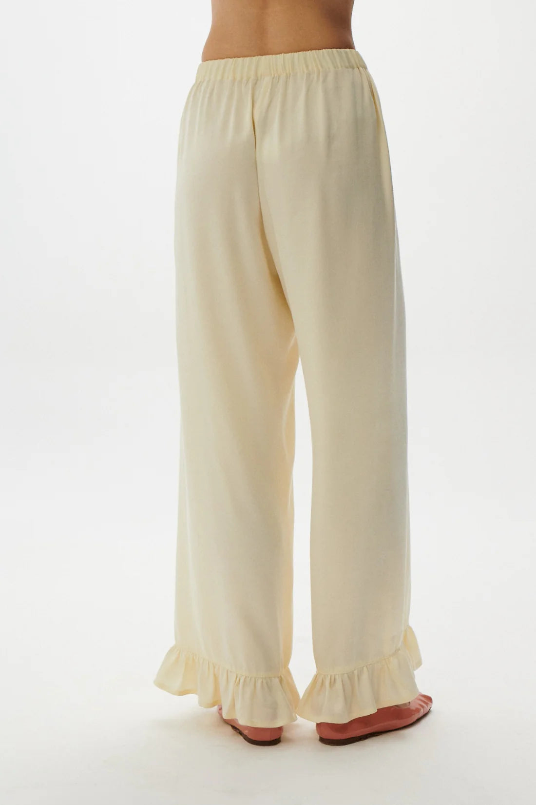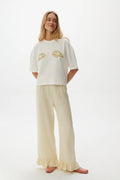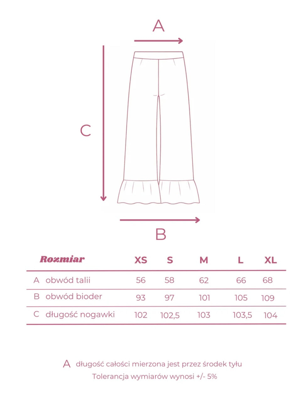 Spodnie Estelle w odcieniu delikatnego masełka to definicja lekkości i kobiecego wdzięku. Wykonane z przewiewnego, subtelnie lejącego materiału, gwarantują komfort, o jakim marzysz podczas ciepłych, leniwych dni. Ich najbardziej urokliwym detalem są szerokie falbanki wieńczące dół nogawek, które nadają stylizacji romantycznego charakteru. Elastyczna guma w pasie zapewnia idealne dopasowanie i swobodę, czyniąc je doskonałym wyborem zarówno do domowego relaksu, jak i na wakacyjne spacery brzegiem morza.