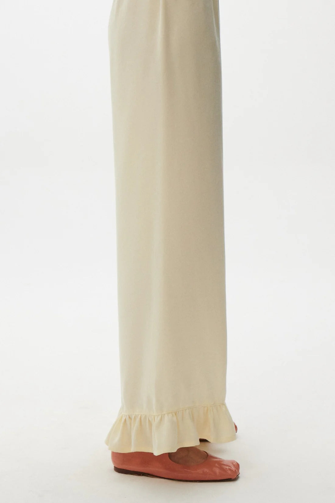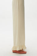 - Proste, szerokie nogawki zakończone efektowną falbaną