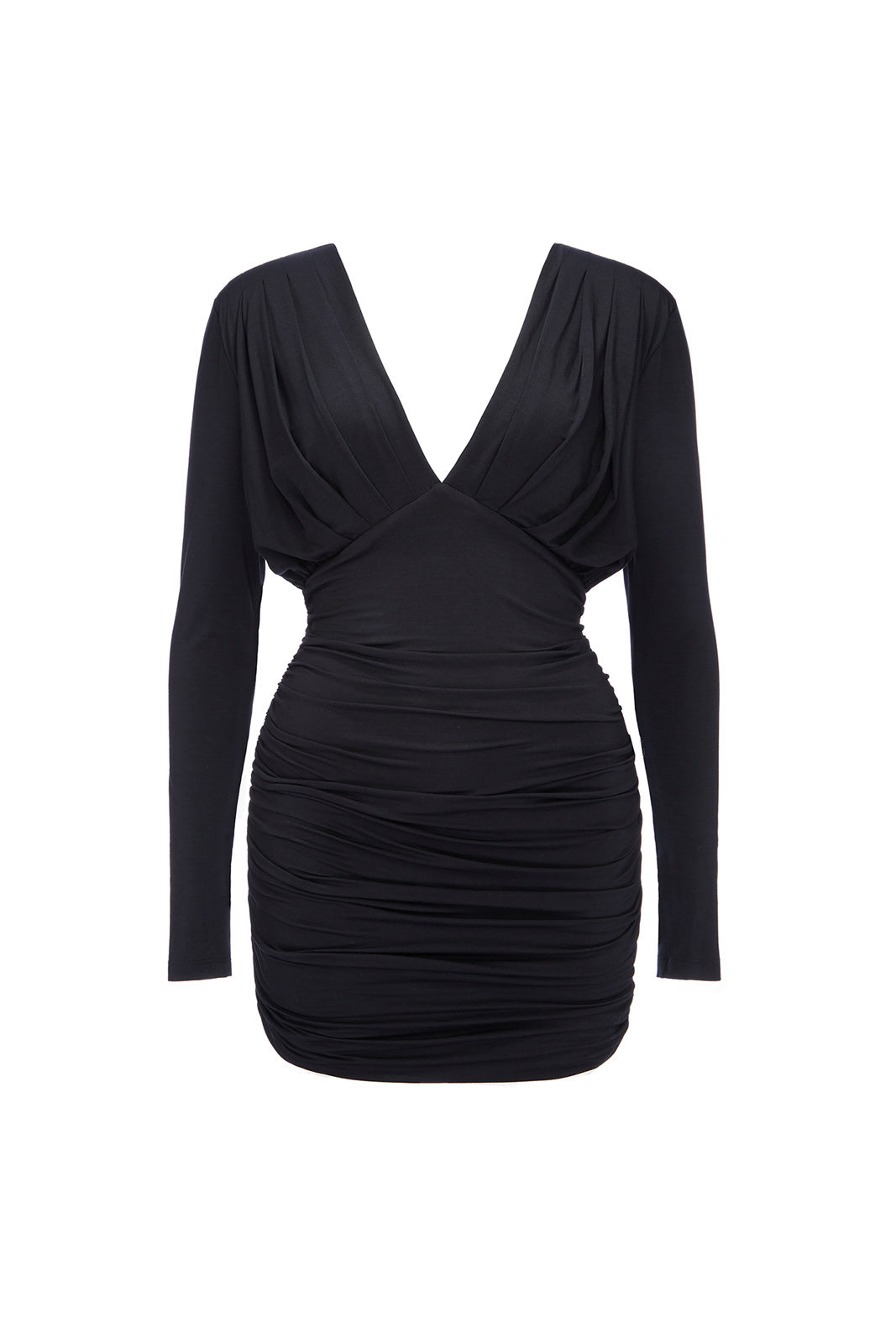 Blair Noir to kwintesencja elegancji i nowoczesnego glamour. Wykonana z wysokiej jakości dzianiny, zapewnia idealne dopasowanie do sylwetki, jednocześnie gwarantując komfort noszenia. Głęboki dekolt oraz marszczenia na całej długości nadają jej kobiecego wdzięku, podkreślając subtelnie linię talii. Długie rękawy i krótki fason tworzą wyrafinowaną równowagę, sprawiając, że sukienka świetnie sprawdzi się zarówno na wieczorne wyjścia, jak i bardziej formalne okazje. To niezastąpiona pozycja w garderobie każdej kobiety, która ceni sobie klasyczną elegancję z odrobiną śmiałości. Produkt posiada poduszki na ramionach.