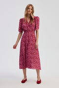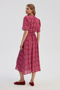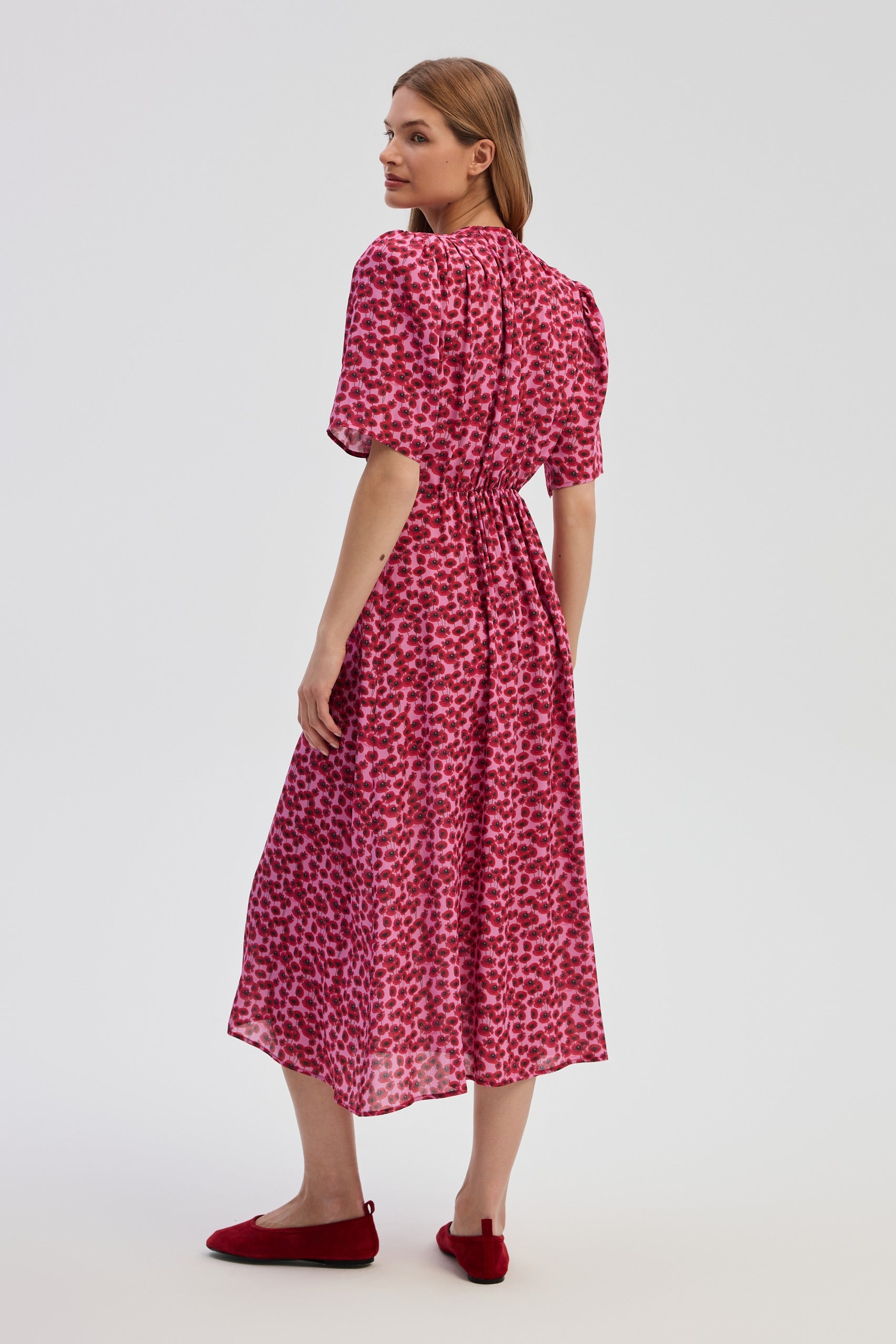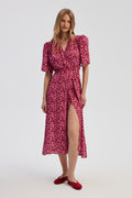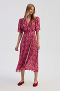 - Sukienka midi z krótkim rękawem, zapinana kopertowo, wykonana ze zwiewnej, lekkiej, lejącej tkaniny.