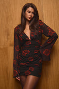 Czarna tkanina ozdobiona intensywnie czerwonym motywem róż nadaje kreacji wyrazistości i romantycznego charakteru. Głęboki dekolt w kształcie litery V dodaje zmysłowości, a zwiewne, transparentne rękawy wprowadzają lekkość i ruch.