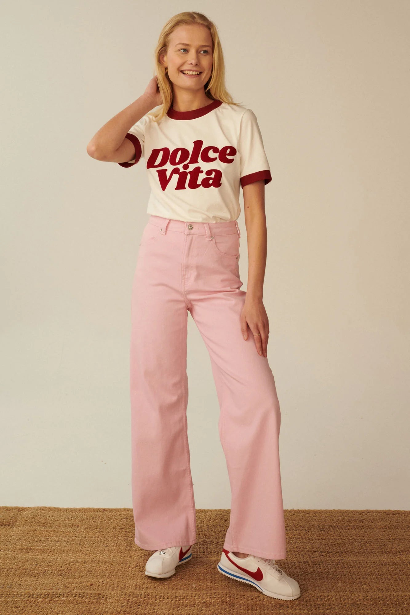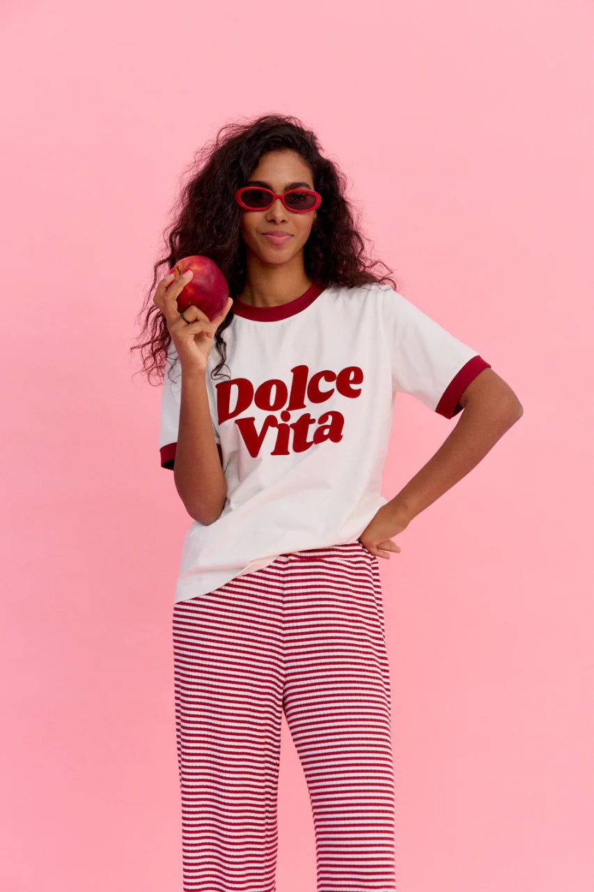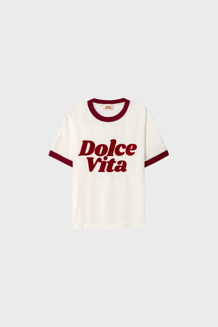 Zachwyć się naszymi T-shirtem "Dolce Vita", który łączy w sobie elegancję i romantyzm. Jego kremowy kolor kontrastuje z bordowymi ściągaczami, nadając wyjątkowy charakter. Welurowy nadruk "Dolce Vita" subtelnie podkreśla luksusowy i romantyczny styl. Idealny na każdą okazję, od romantycznych wieczorów po spotkania z przyjaciółmi.