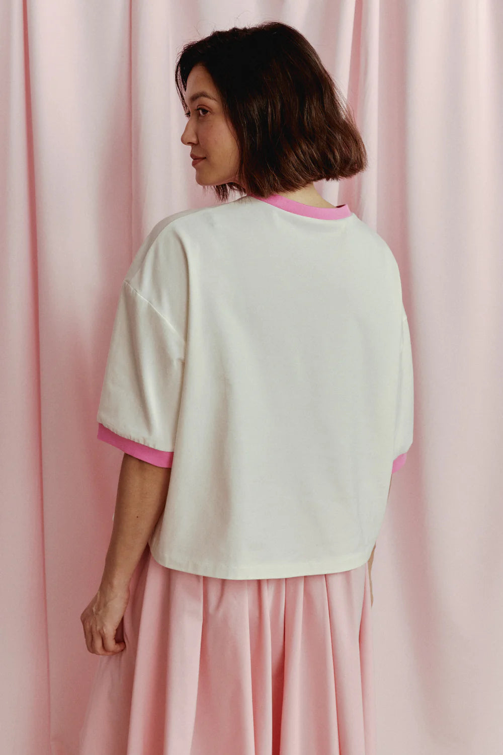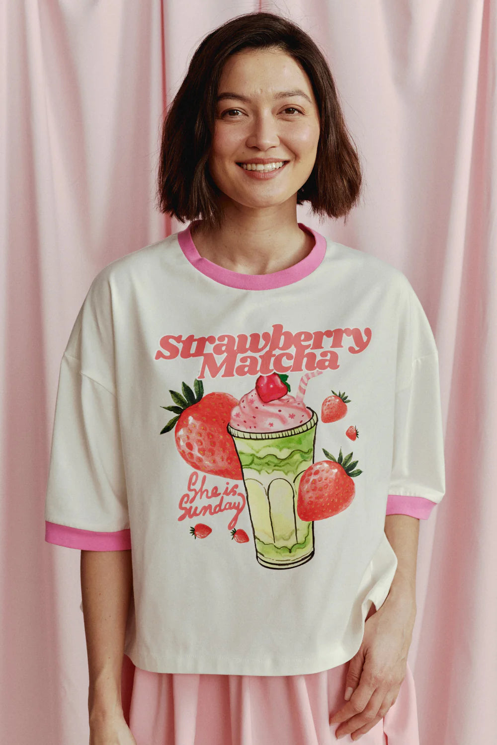 Postaw na kremowy T-shirt STRAWBERRY MATCHA o kroju boxy, który łączy swobodę i oryginalny styl. Różowe ściągacze dodają kontrastu, a autorski nadruk „Strawberry Matcha” z motywem truskawek i zielonej herbaty nadaje mu wyjątkowego charakteru. Wykonany z wysokiej jakości bawełny, zapewnia komfort i świetnie wpisuje się w estetykę miłośniczek słodkich, pastelowych akcentów.