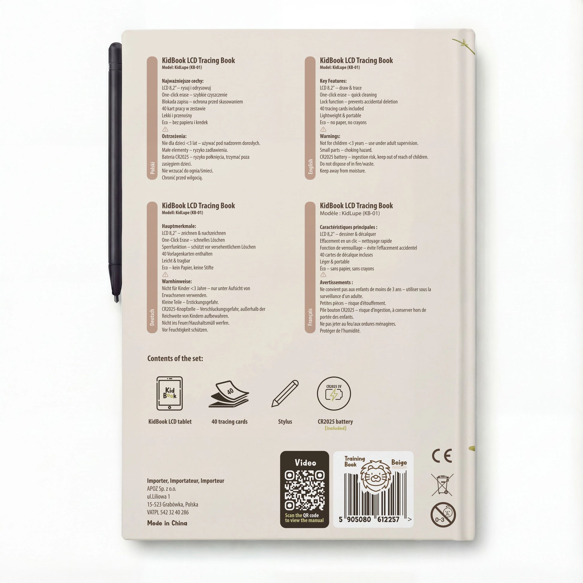 Tablet LCD pozwala rysować i ćwiczyć bez zużywania papieru – jednym przyciskiem można wyczyścić ekran i zacząć od nowa. KidBook wspiera koncentrację, rozwój motoryki małej oraz samodzielność dziecka, jednocześnie pozostając lekkim, bezpiecznym i gotowym do użycia w każdej sytuacji.