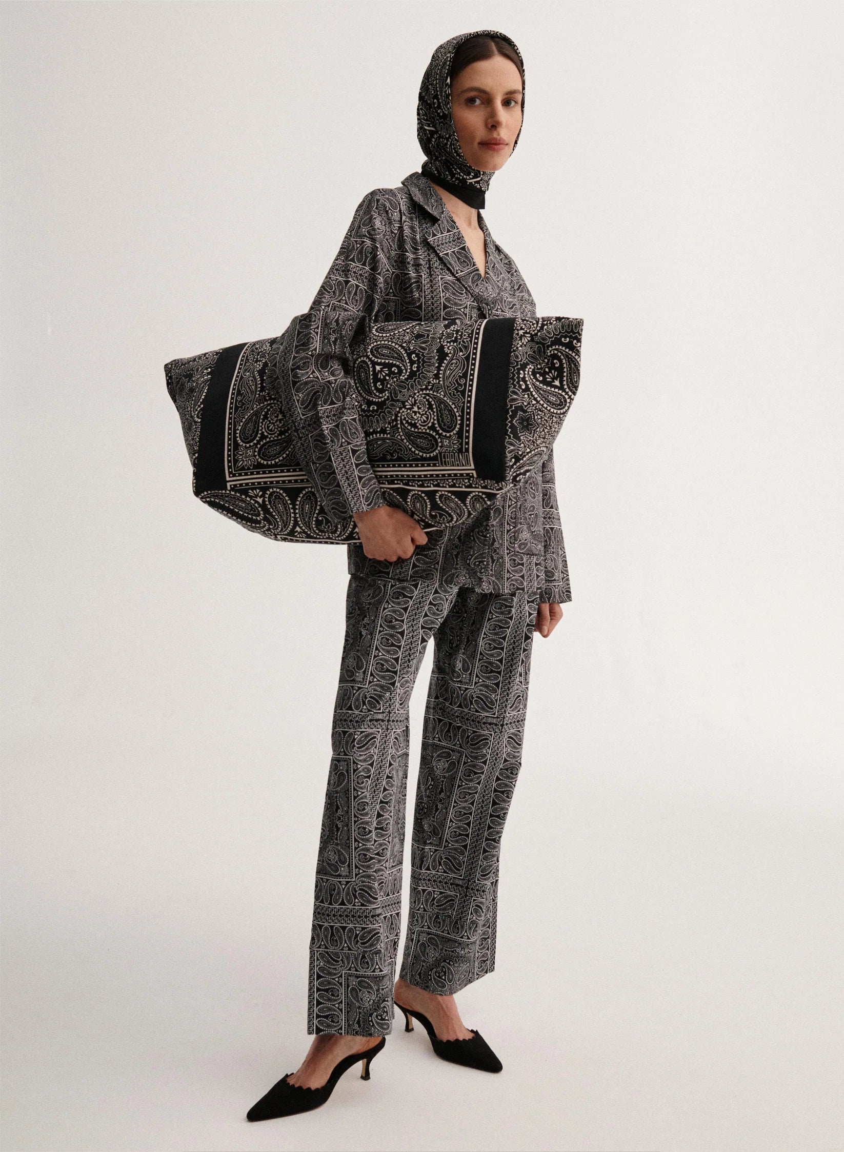 Torba oversize typu shopper wykonana z grubego bawełnianego płótna z nadrukiem bandany w kolorze czarnym i ecru.